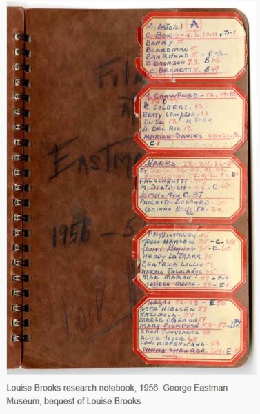 Back in 2015, I visited the George Eastman Museum in Rochester, New York. The purpose of my visit was to spend time at the museum with which Louise Brooks was so closely associated for many years — and, to read Brooks’ unpublished notebooks. It was a trip five years in the making. Back in October of 2010, I wrote a piece for examiner.com, which was reworked for the Huffington Post, titled “Louise Brooks Journals to be Revealed, and Perhaps Published“. My piece was occasioned by an announcement by the then George Eastman House that it had unsealed the actress’ unpublished notebooks. Brooks had bequeathed her notebooks to the museum with instructions they remain sealed for 25 years following her death. Brooks passed away in 1985, and in her will, she gave the museum her notebooks, her personal library, and other papers and photographs. My piece drew the attention of various interested individuals, including the Pulitzer Prize winning film critic Roger Ebert, as well as the bestselling author and Louise Brooks’ fan Neil Gaiman. Both tweeted about my article.